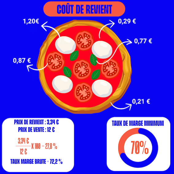 Pour avoir une vision claire du coût de revient, examinons une illustration concrète. Imaginons que nous envisageons de commercialiser une pizza margherita à 12€ dans notre restaurant. Il est essentiel de calculer le taux de marge brute pour déterminer si notre marge est suffisamment élevée.