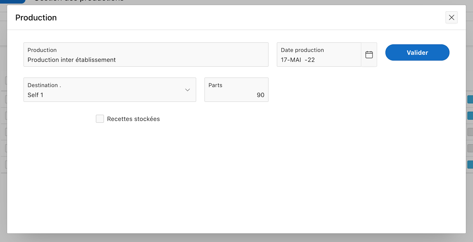 - Vous allez saisir quel type de production que vous souhaitez entrer (transfert inter établissement, production boulangerie…).