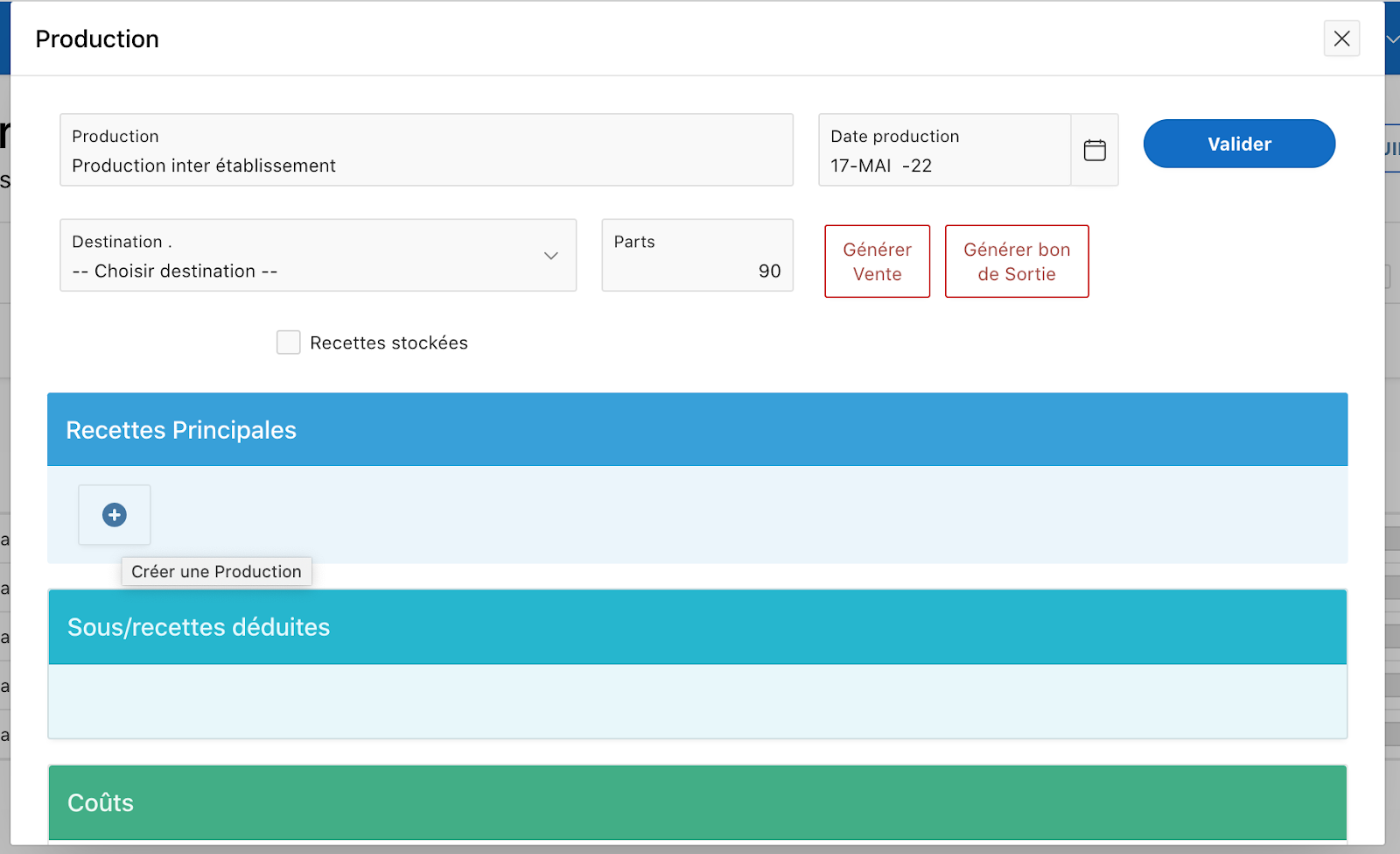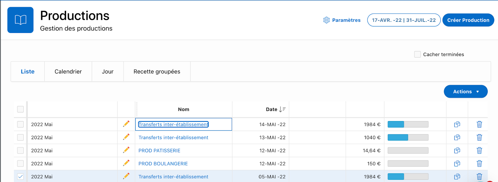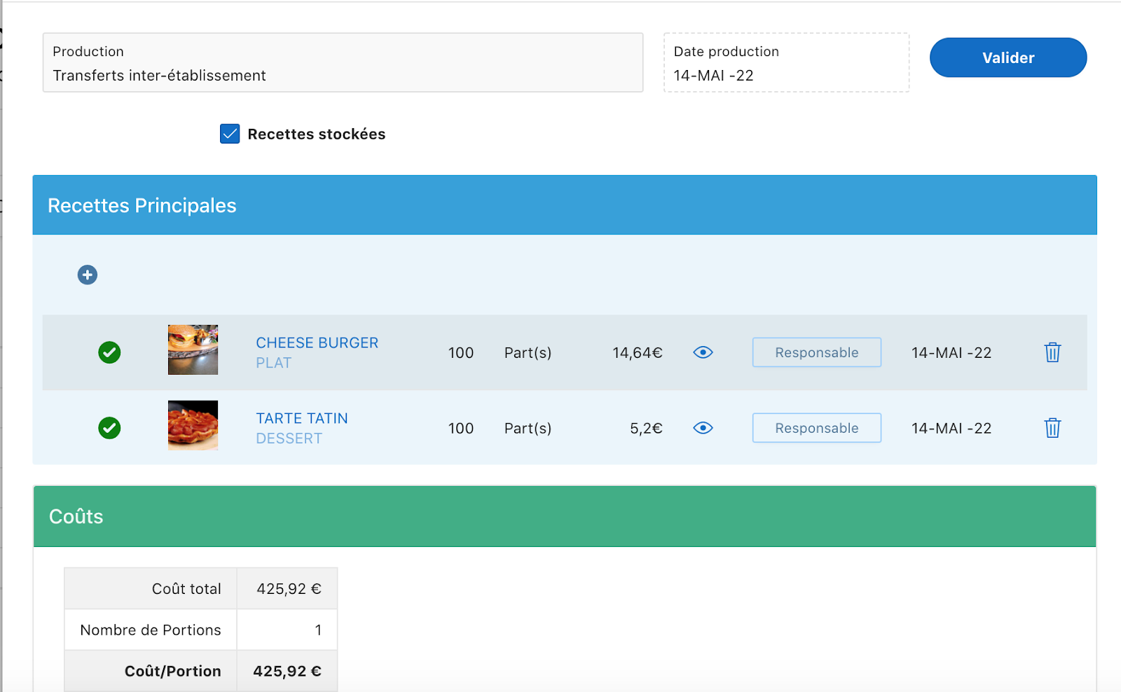 - Le coût matière pour l’ensemble de vos portions (Exemple : votre coût matière pour la production des 100 parts de tartes tatins prévue le 24 mai 2022 )